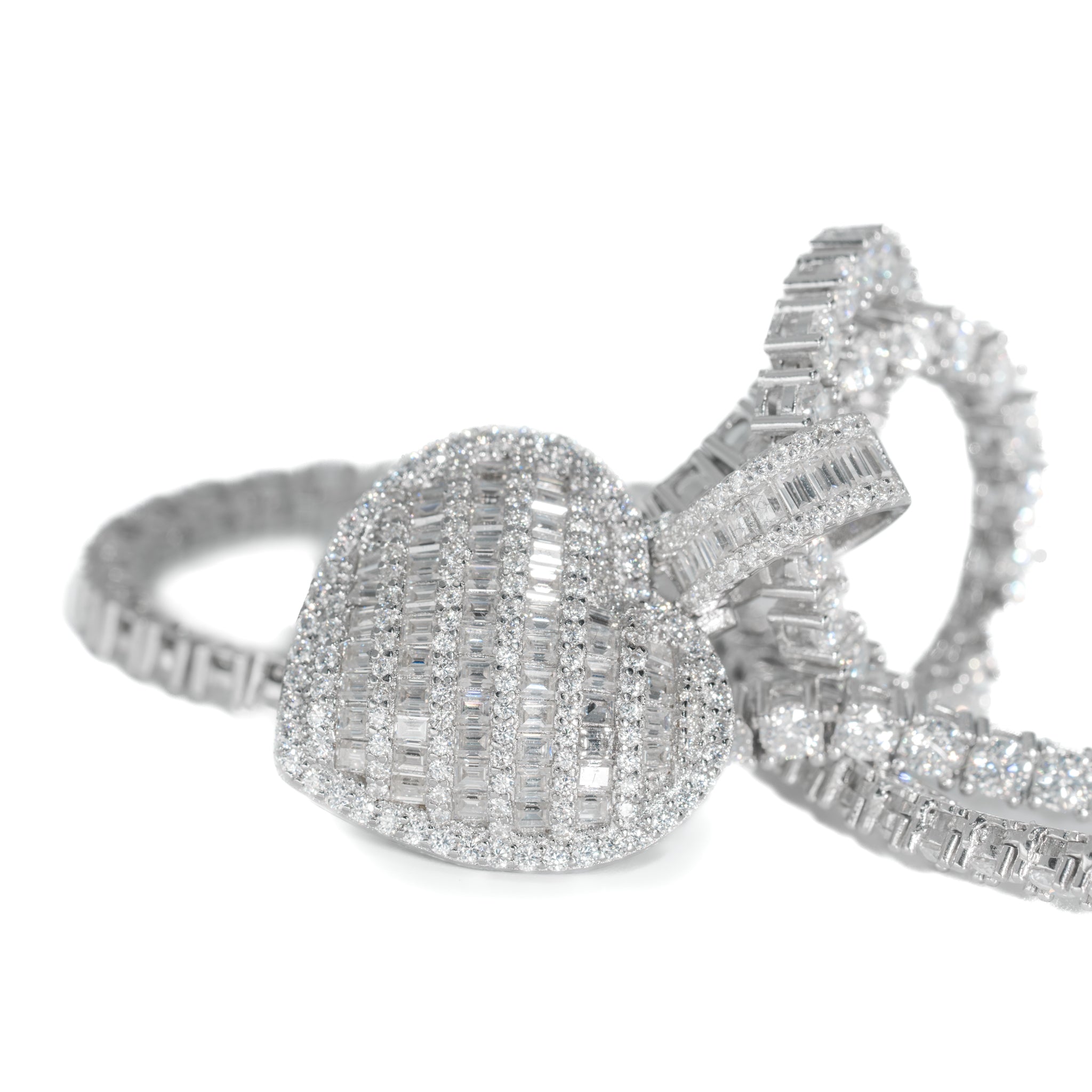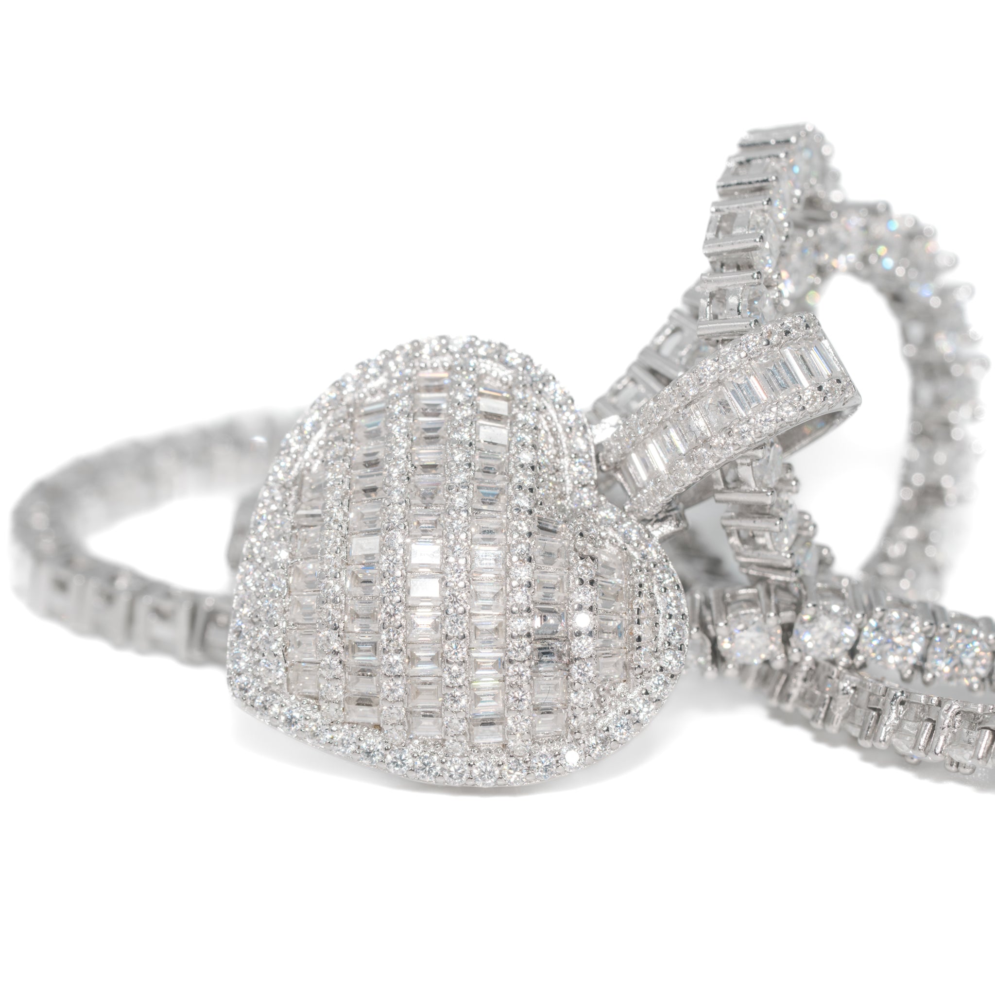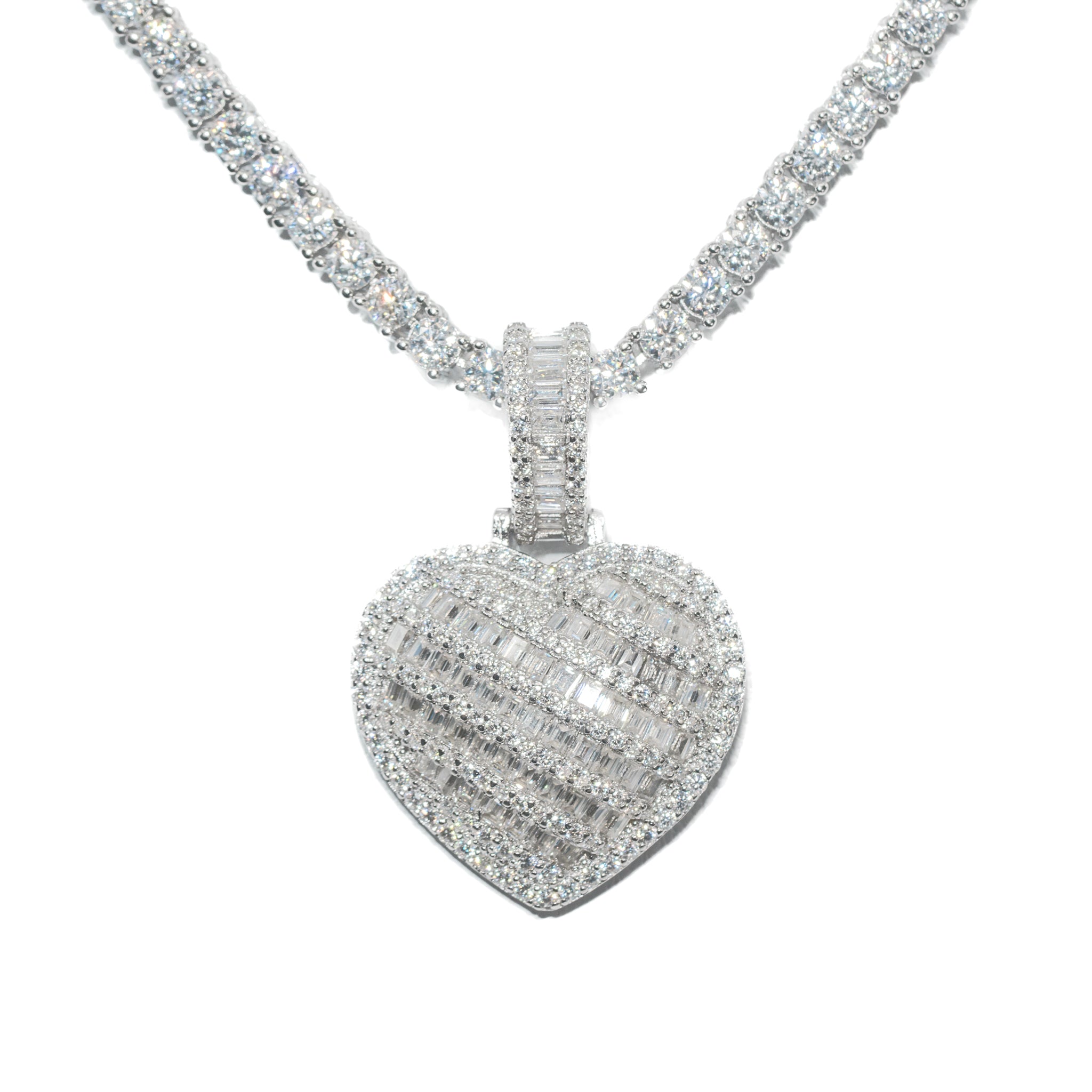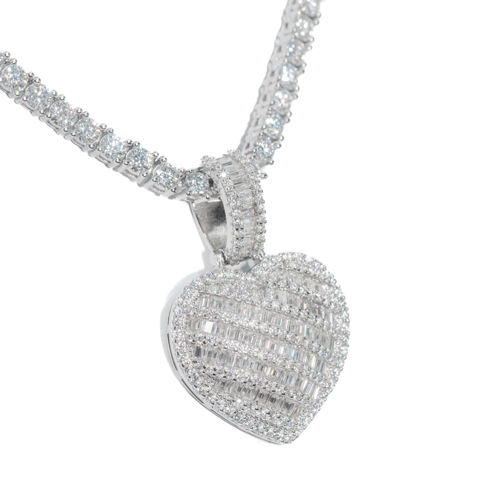 The centerpiece of this design is the heart shape, a classic symbol of love and loyalty, reimagined with an iced-out finish. The interior is flooded with rows of baguette-cut stones, laid in a diagonal pattern that gives the piece texture and depth. Each baguette reflects light differently than round stones, creating a sleek, glass-like shine that stands out under any lighting. Framing the baguettes is a radiant halo of brilliant round VVS1 lab Moiss stones, hand-set to amplify the fire and maximize the pendant’s overall brilliance. Together, the baguettes and rounds create a striking contrast, balancing sharp lines with radiant sparkle for a design that feels both bold and elegant.