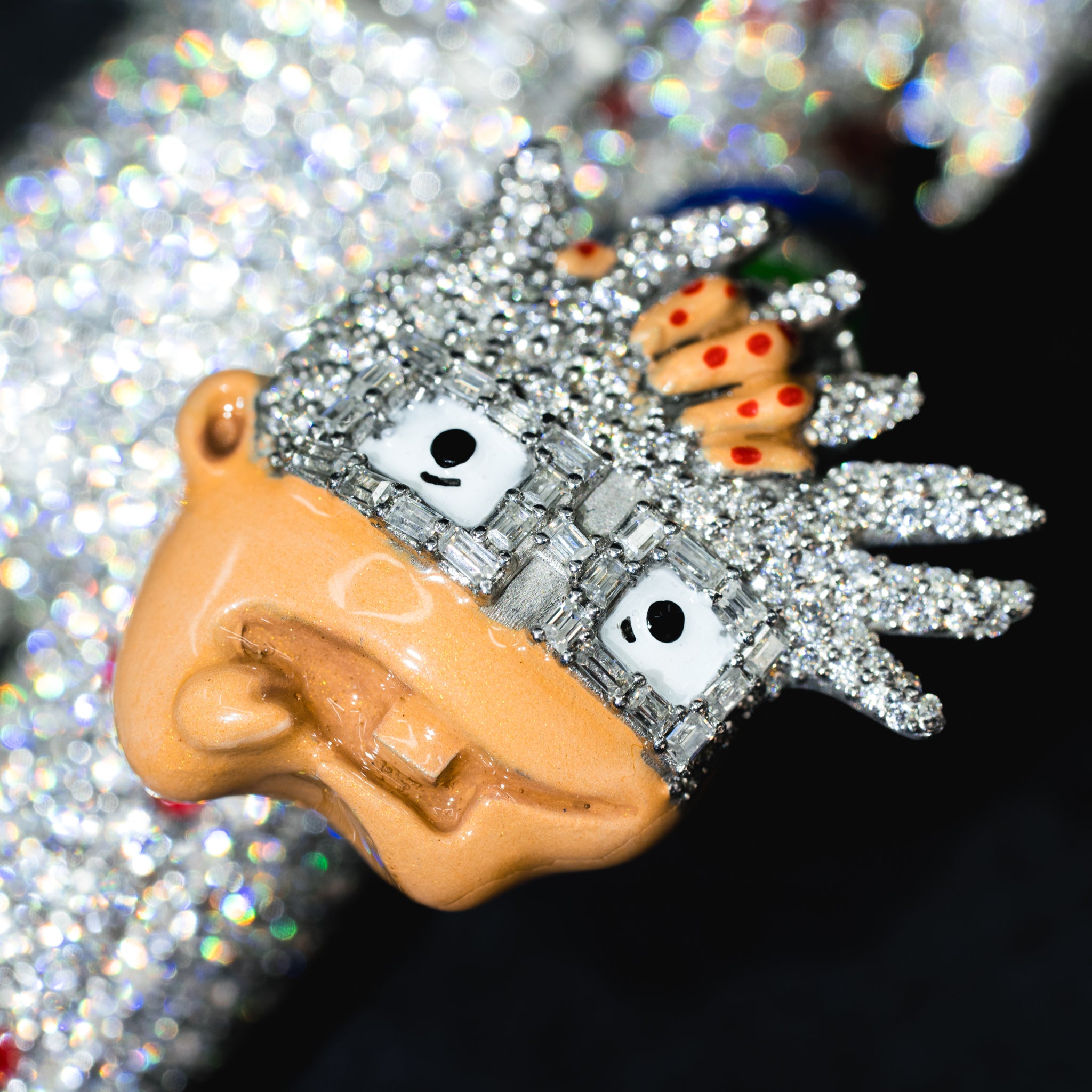 Every detail of Chucky has been brought to life with expert craftsmanship. From the sinister smirk on his face to the stitched-up scars carved into his skin, this pendant captures his menacing look in incredible detail. He’s holding a bat in one hand and a severed head in the other, and both are fully iced out with lab Moiss stones that sparkle under any light. Even the sleeves of his outfit are highlighted with colorful enamel detailing in red, green, and blue, while his sneakers feature vibrant red accents that add a touch of realism to the piece. The combination of full pave stone-setting and carefully placed enamel makes this pendant a true piece of art, not just jewelry.