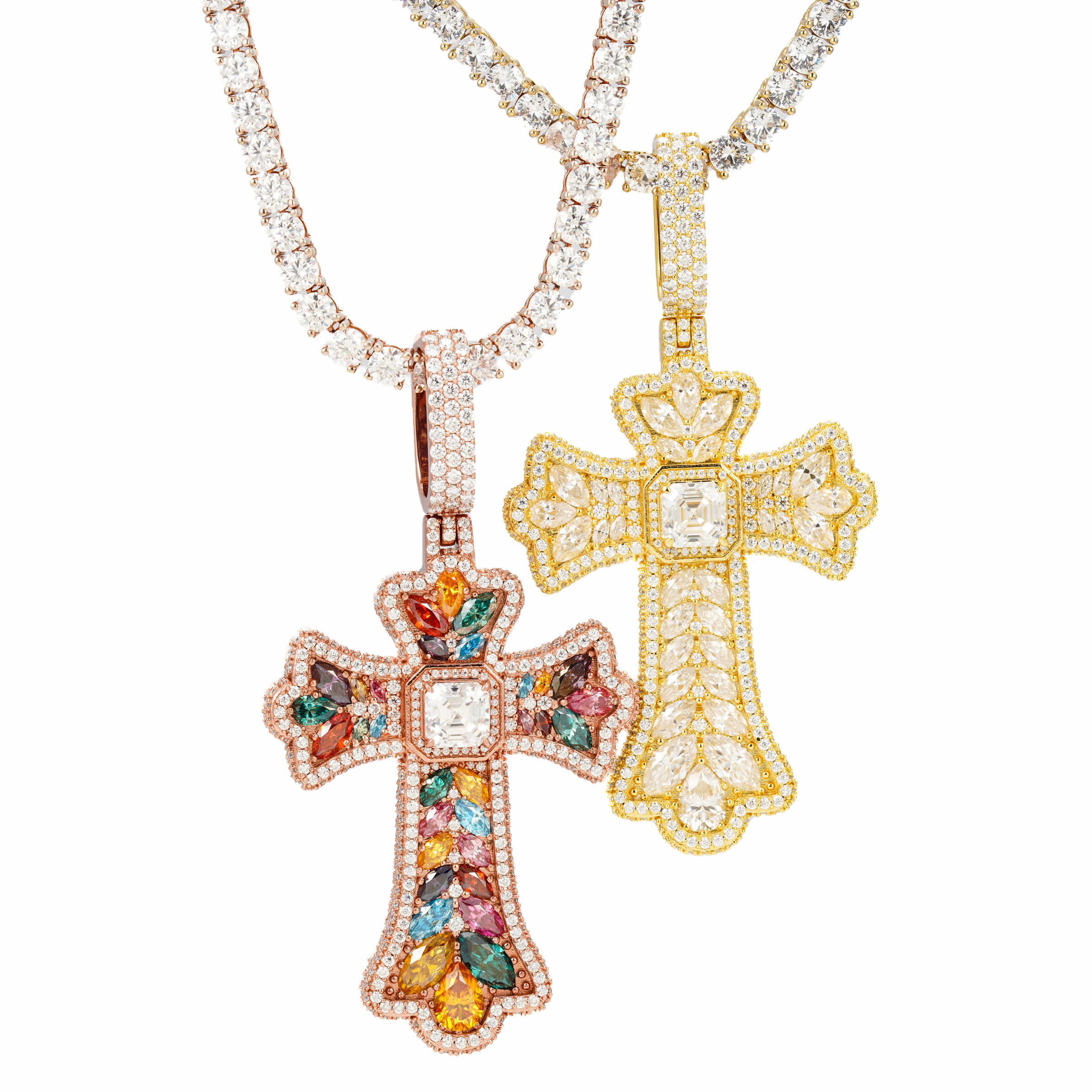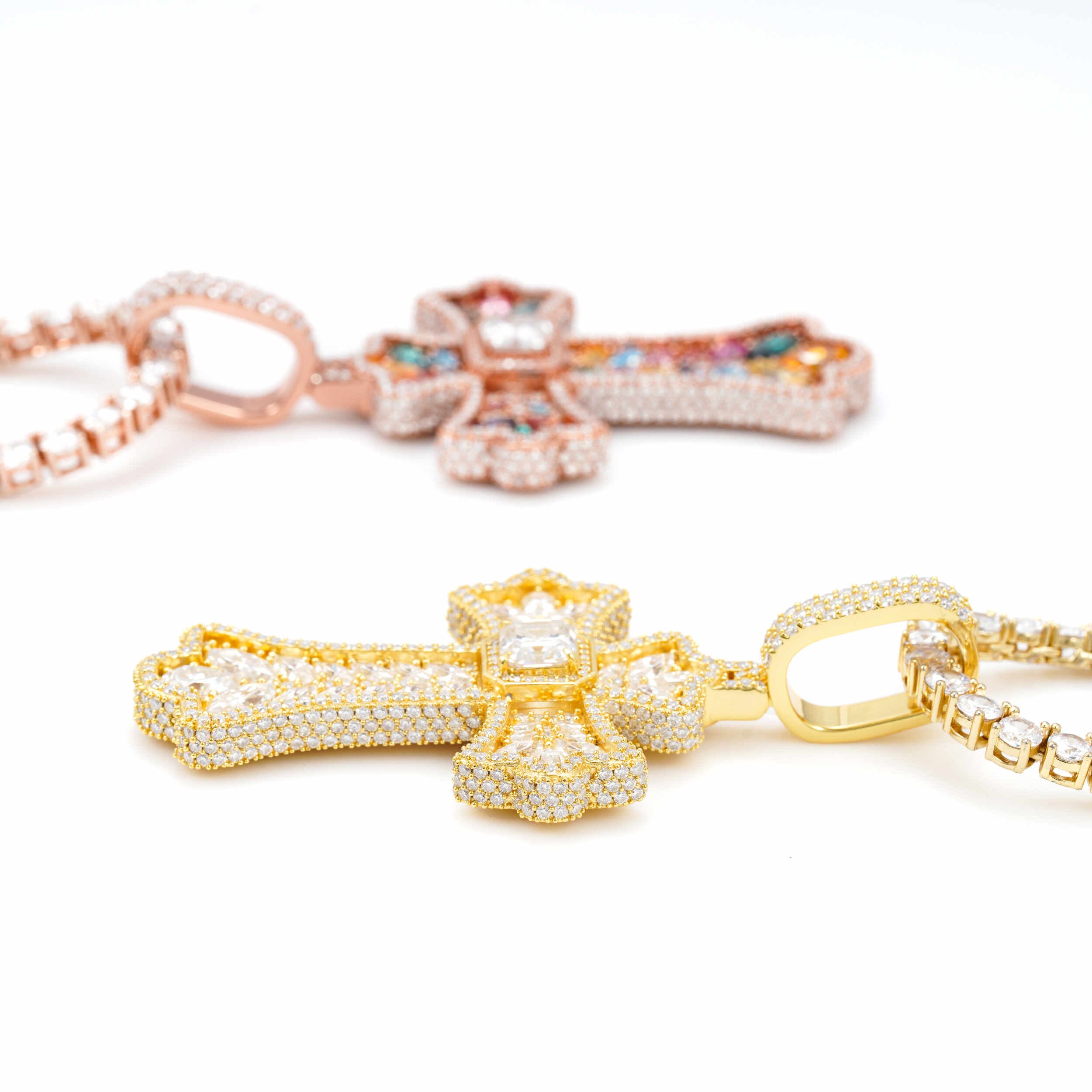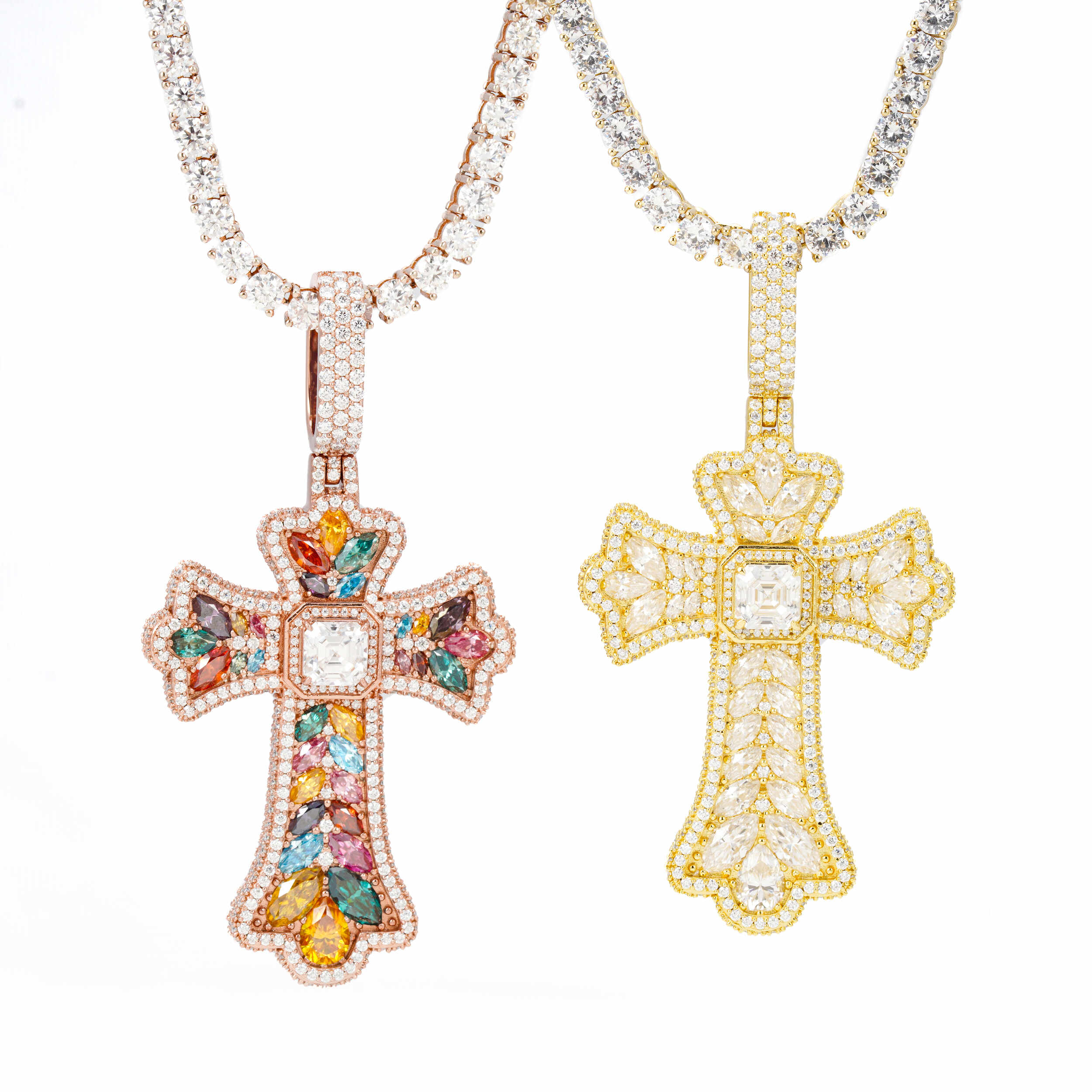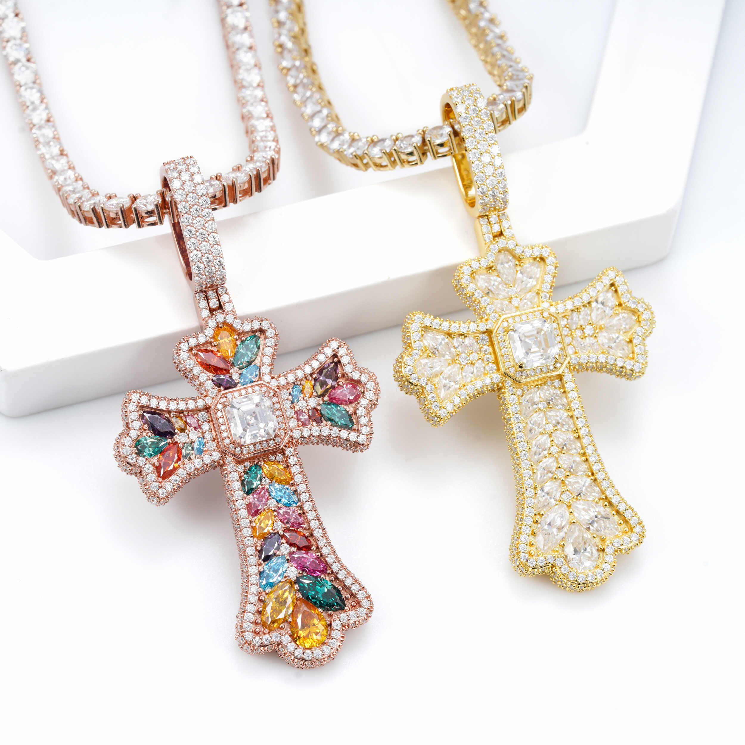 Cross Full of Art – a masterpiece of color and brilliance. Crafted with VVS1 lab-grown Moissanite that passes the diamond tester, each stone is meticulously hand-set for perfection. Made from 925 sterling silver, this stunning piece is designed to stand out. With a vibrant, expertly crafted setting, you simply can't go wrong. Comes With A Tennis Chain.