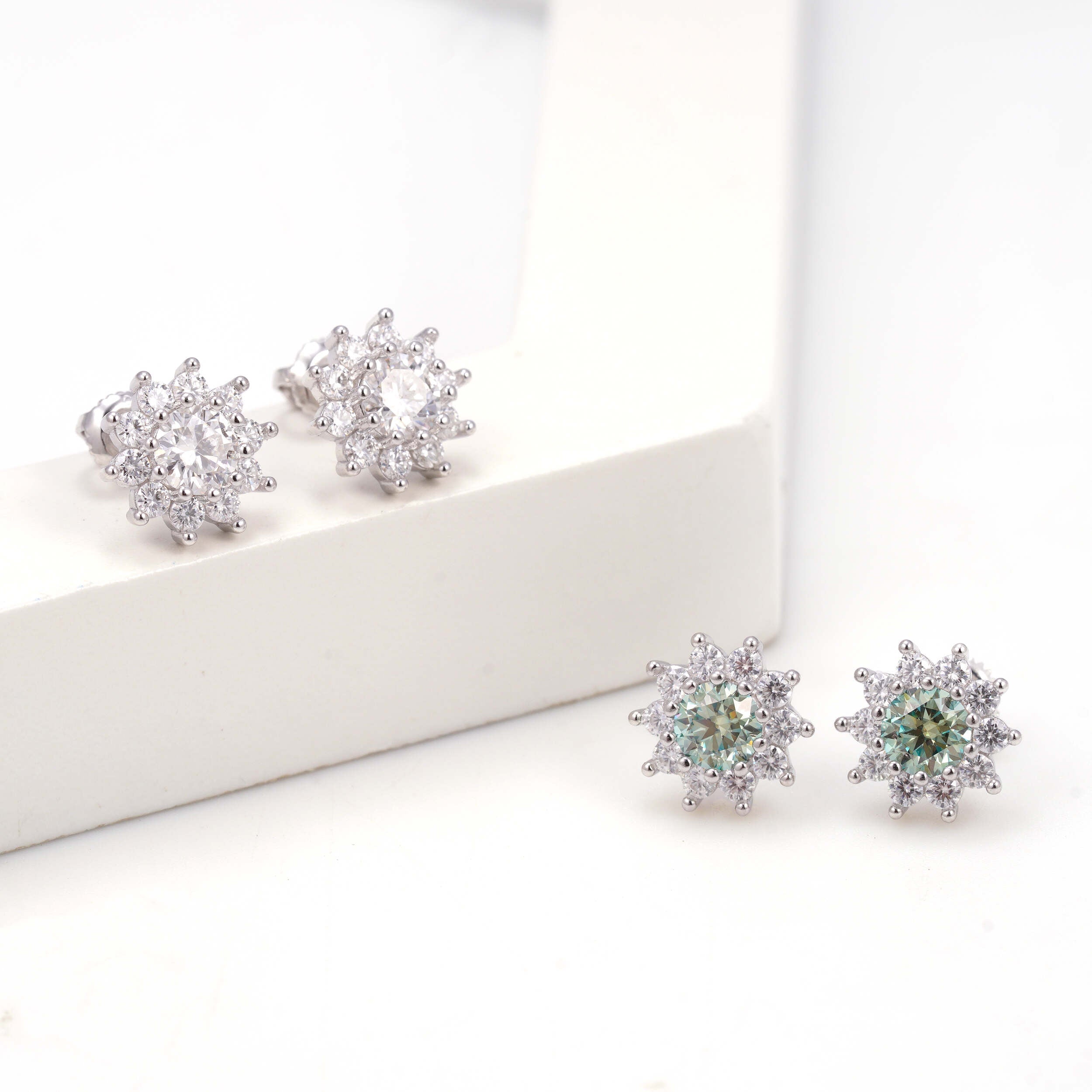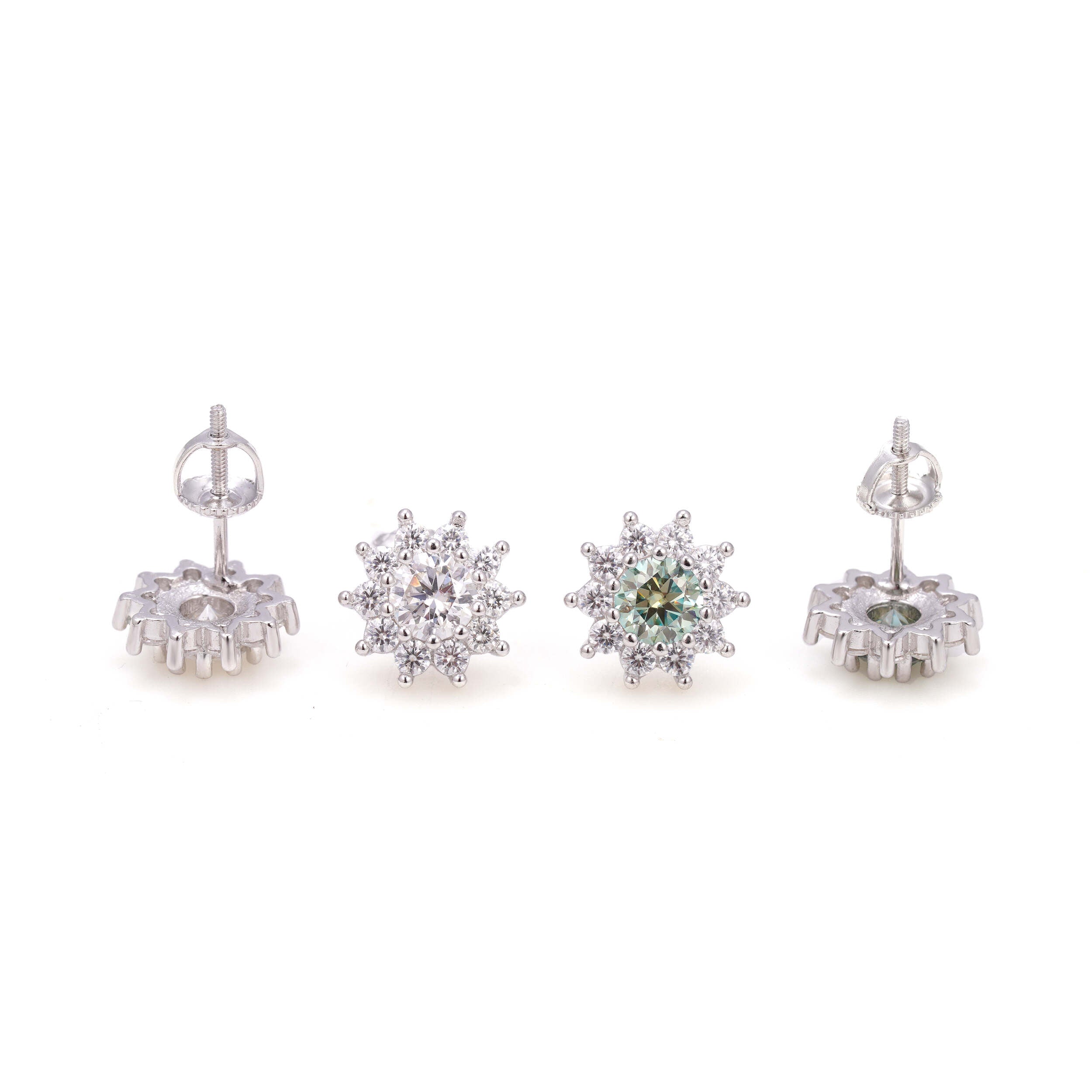 Encircling the center stone is a perfectly balanced halo of smaller Moissanite stones, arranged in a floral-inspired design that evokes grace, femininity, and timeless charm. The result is a radiant burst of sparkle from every angle — whether under soft candlelight or sunlight, these earrings catch the eye effortlessly.
