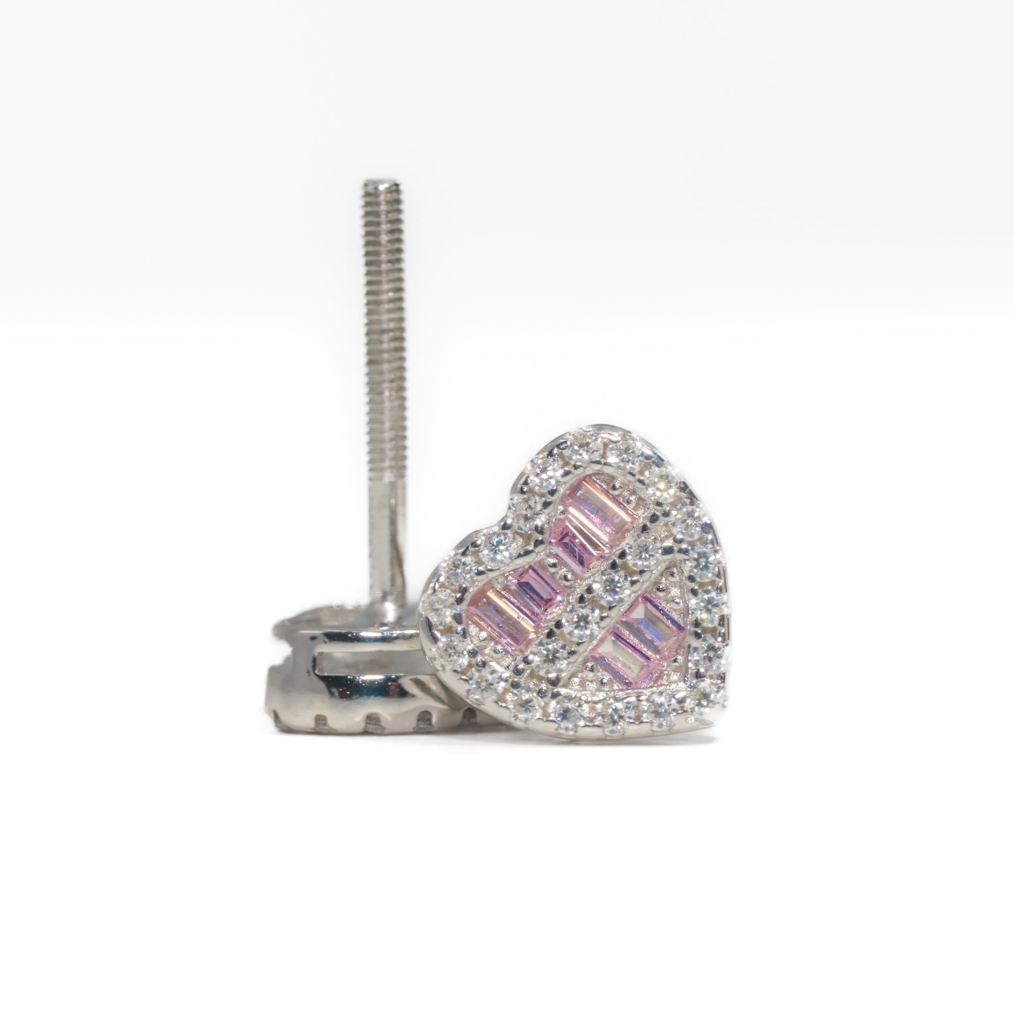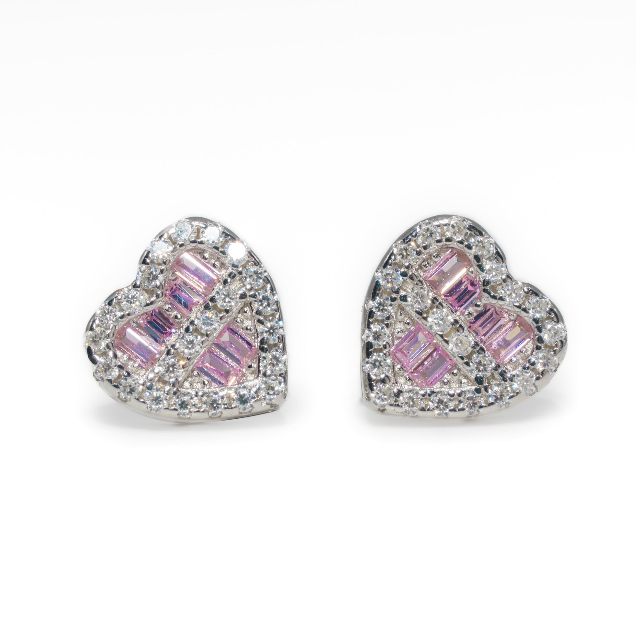 At the center of each heart lies a striking arrangement of purple baguette-cut VVS1 lab Moiss stones, carefully aligned in diagonal rows that give the design structure and depth. The purple stones provide a unique burst of color, contrasting beautifully with the brilliance of the surrounding halo. Encircling the baguettes are shimmering round-cut VVS1 lab Moiss stones, each one hand-set to maximize light reflection, ensuring that every movement catches the eye with diamond-like fire. The combination of baguettes and rounds creates a layered, radiant effect that balances color and clarity to perfection.