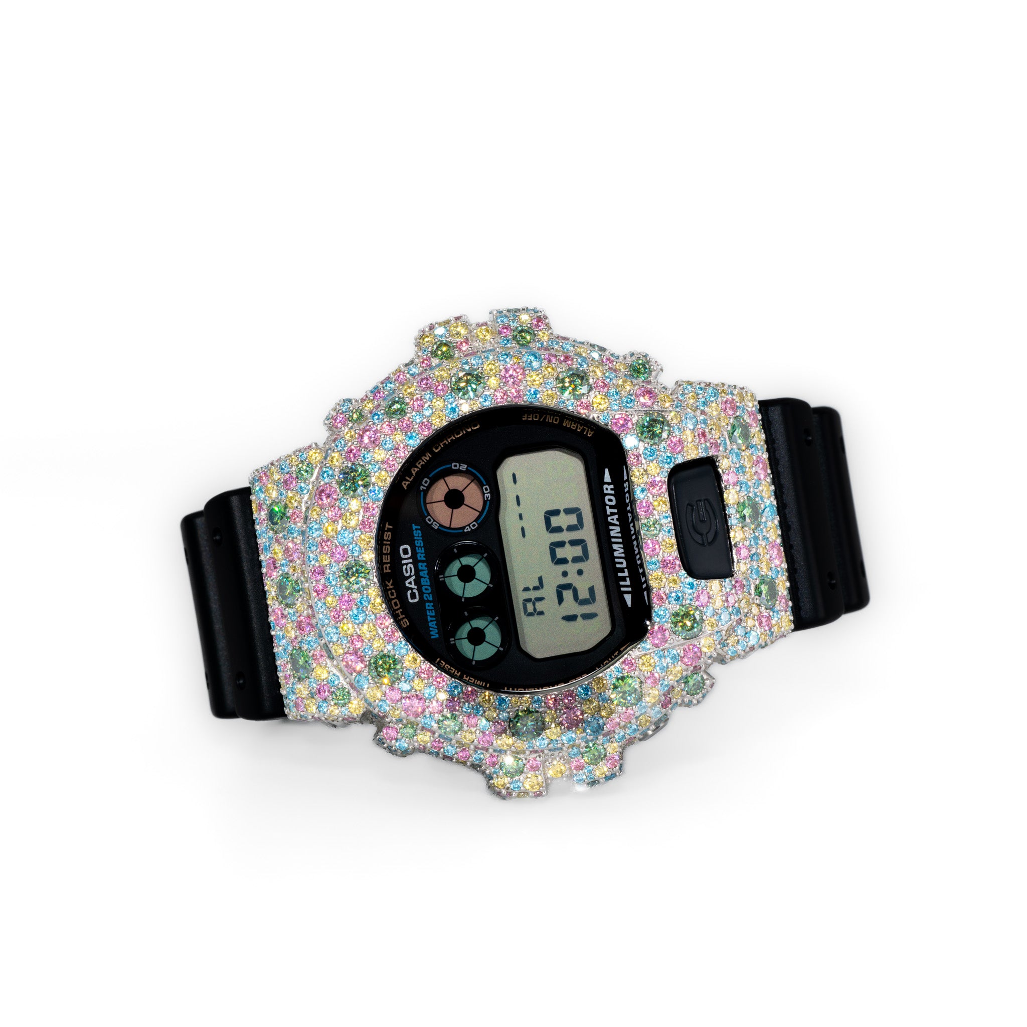 Every detail of this custom G-Shock is crafted to impress. From the bezel to the case, it’s completely encrusted with rainbow moiss stones that burst with vivid colors, reflecting light in every shade and angle. The vibrant flood design makes it a true showstopper—whether you’re stepping out for the night, hitting a concert, pulling up to a car meet, or just rocking your fit during the day, this watch guarantees attention on your wrist.
